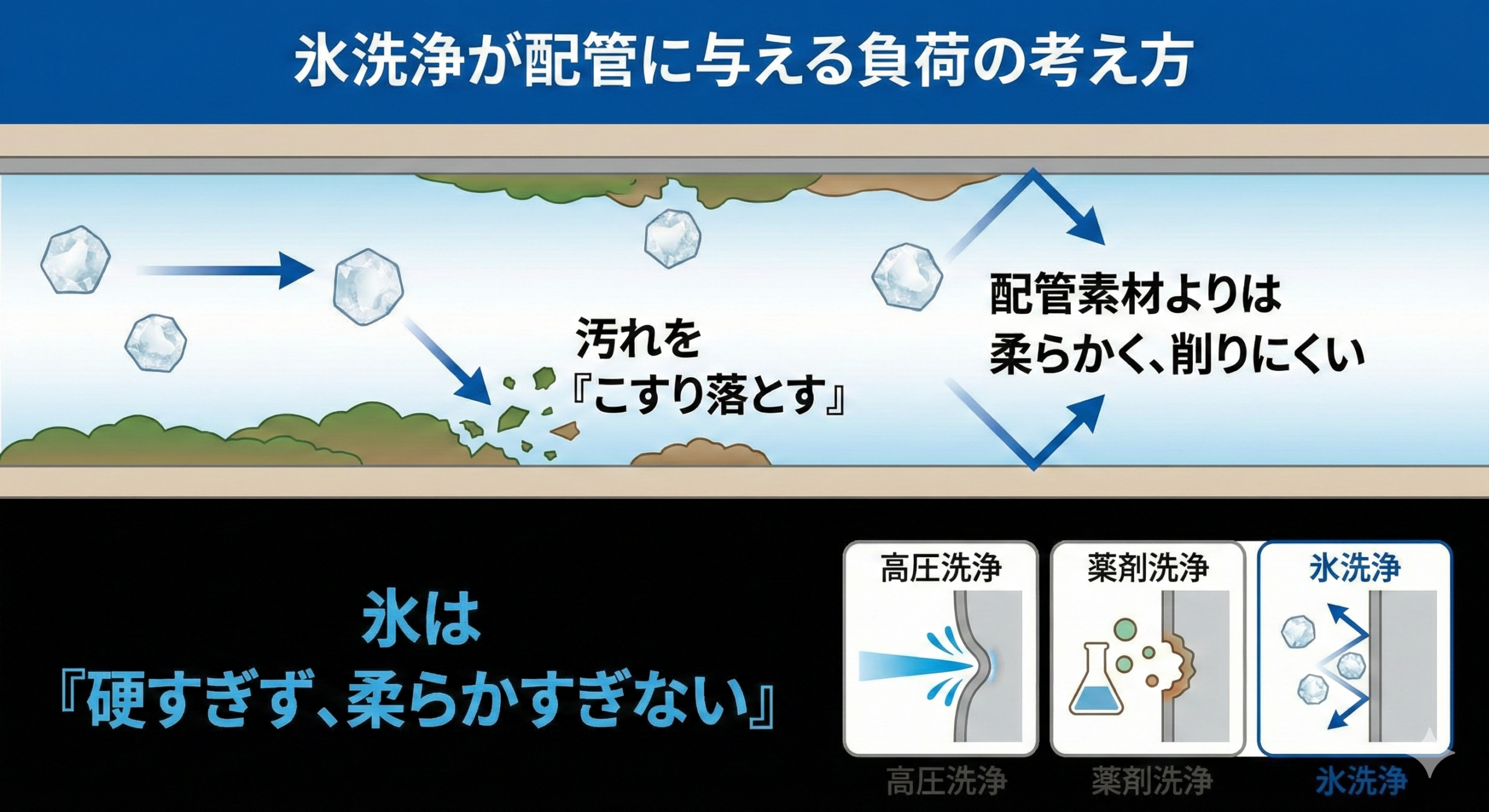 なぜ氷洗浄が配管を傷めにくいのかを、