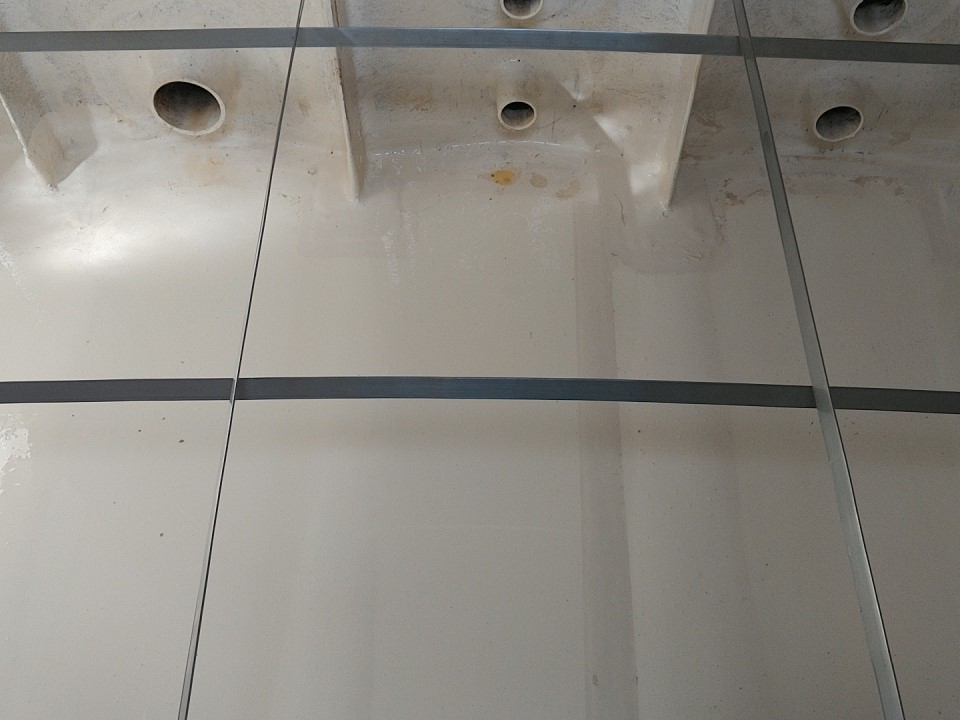 毎年ご依頼をいただいている現場ですが、いざ水槽の中を確認すると、やはりこの1年で水垢や細かな沈殿物がしっかりと付着していました。